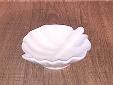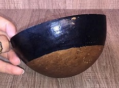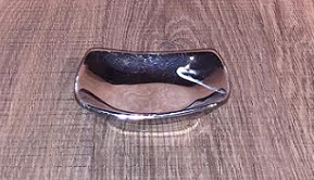 Tem aspecto "amassado/martelado" na parte interna e bordas irregulares.